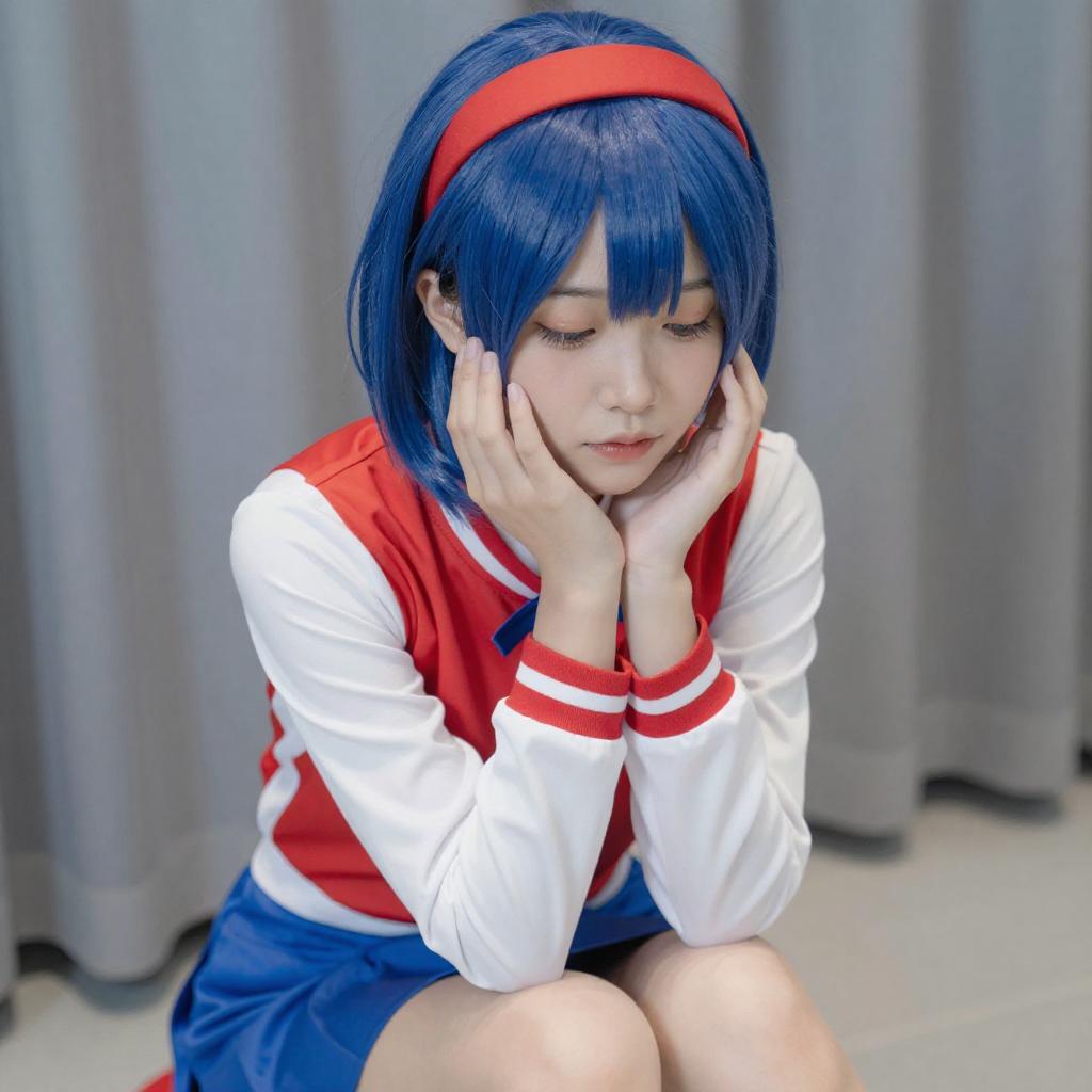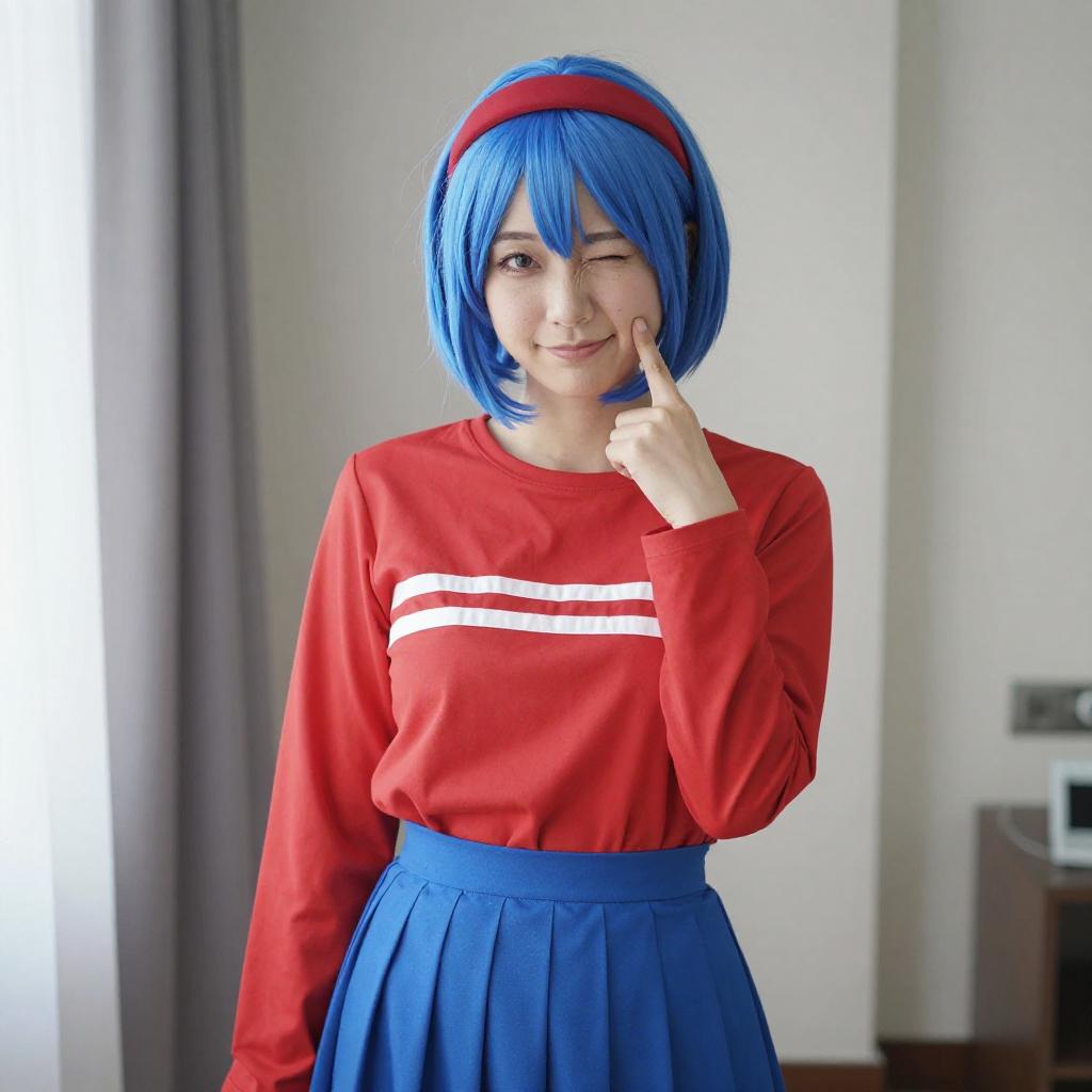 Photograph of an Asian woman with blue bob hair, wearing a red headband, red long-sleeve top with white stripes, and a blue pleated skirt. She winks, touching her cheek with her right hand, standing in a bright room with gray curtains.