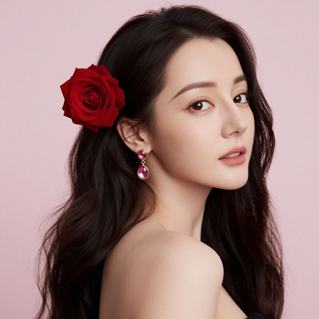 Portrait featuring a woman with cascading dark hair adorned by a vibrant red rose, complemented by elegant gold earrings with pink gemstones, set against a soft blush background.