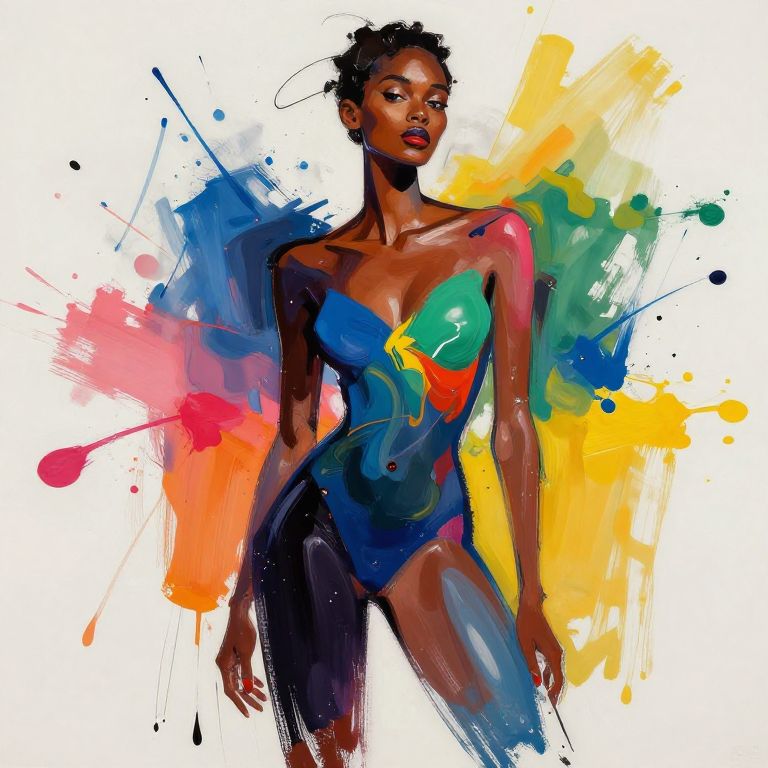 Rina Sawayama body depicted in an abstract art style, bold brush strokes, vibrant color splashes, fluid shapes forming the silhouette, modern expressionism, energetic and stylish composition