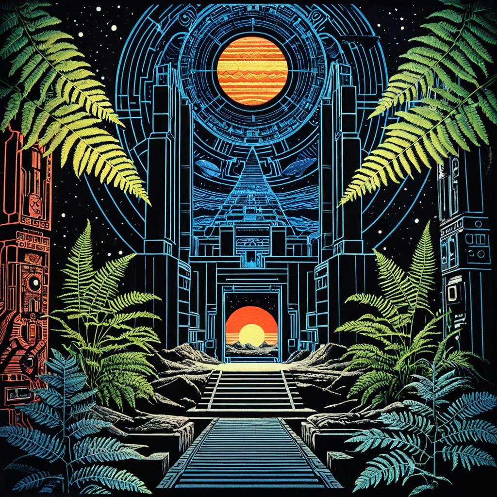 1978 cut out collage, science fiction movie set, neon aztec, break of dawn on jupiter, epic theater , tropical ambience, ancient fern, electro schematics, film noir, in part by alex grey, part by hale woodruff