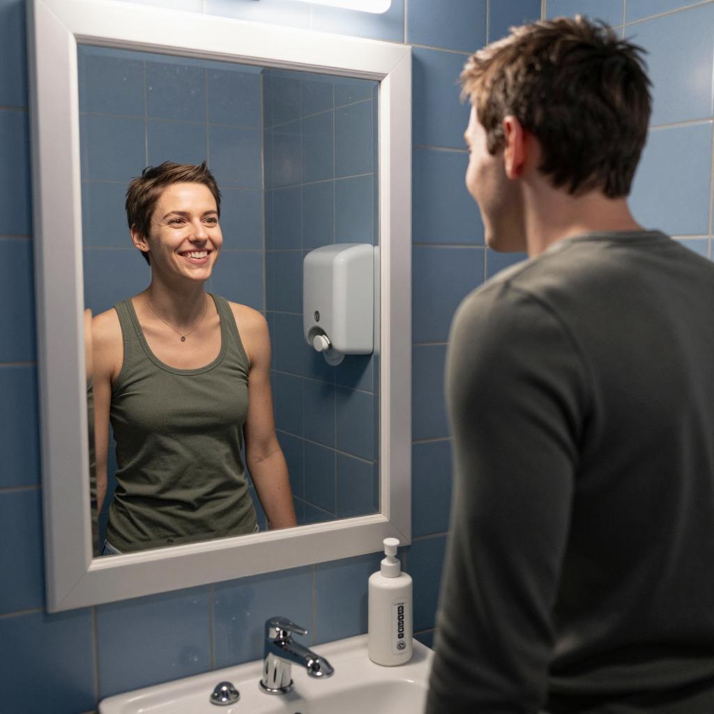 A young couple standing in a bathroom looking into a wall-mounted mirror. The woman, with short brown hair and wearing a green tank top, smiles as she looks at the man. The man, with short brown hair and wearing a green sweater, is looking at her reflection with a smile. The bathroom features blue tiled walls, a white framed mirror, a sink, and a wall-mounted soap dispenser.