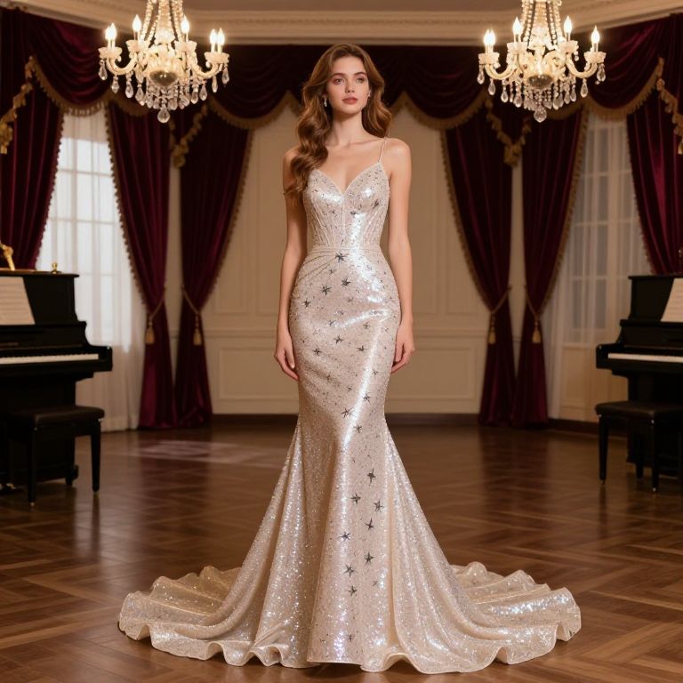 Photograph of a tall, slender woman with long, wavy brown hair standing in an elegant ballroom. She wears a form-fitting, silver sequined gown with a deep V-neck and a long, flowing train, adorned with small star patterns. Her skin is fair, and she has a composed, confident expression. The background features dark purple drapes with gold tassels, two black grand pianos on either side, and two ornate chandeliers hanging from the ceiling. The floor is wooden parquet, and the room is well-lit, highlighting the shimmer of her dress.