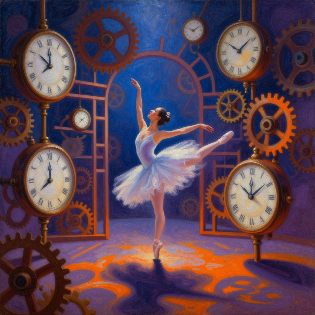 A surreal oil painting depicting a whimsical dreamlike scene where a graceful ballerina dances amidst a floating maze of oversized clocks and gears. The fluid movements of the ballerina appear ethereal as she weaves through the intricate mechanical labyrinth with grace, her arms elegantly raised and limbs extended in perfect balance. Vibrant colors dominate the scene, including deep blues, rich purples, and fiery oranges, creating an atmosphere of wonder and mystique. As light plays upon the reflective surfaces of the clocks and gears, it casts mesmerizing shadows across the floor, enhancing the dreamlike quality of the image and evoking a sense of both enchantment and melancholy.
