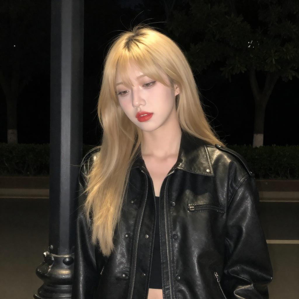 Portrait of a young woman with long blonde hair wearing a black leather jacket and red lipstick. She stands near a dark ornate street lamp in a dimly lit nighttime urban setting with dark green foliage in the background. The woman gazes downward with a neutral expression.