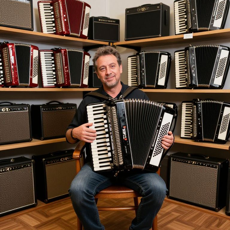 Paul Ramunni, seated in a wooden chair, proudly displays a black-and-white accordion while surrounded by a meticulously organized collection of various accordions and amplifiers neatly arranged on shelves inside the newly relocated New England Accordion Connection & Museum Company in Salisbury.