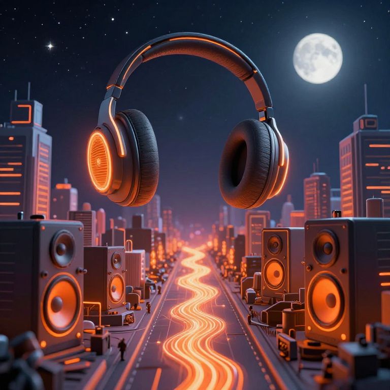 A digital illustration depicts a surreal cityscape at night with a glowing full moon in the sky. Large, glowing orange headphones hover above a neon-lit road lined with towering skyscrapers. On both sides of the road, speakers with illuminated orange speakers are placed, emitting a vibrant light. Small, dark silhouettes of people walk along the road, which is illuminated by bright orange lights. The sky is a deep blue, dotted with stars, adding to the futuristic and dreamlike atmosphere. The overall style is vibrant and hyper-realistic with a focus on neon and glowing effects.