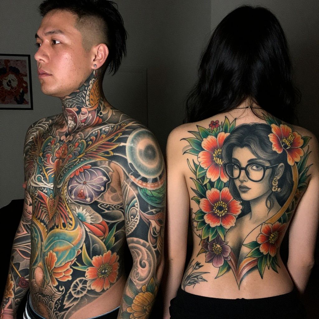 Photograph of a tattooed man and woman; man's chest and neck covered in vibrant, colorful tattoos, woman's back features detailed black-haired woman
