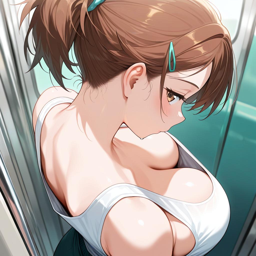 1girl, spiky hair, brown eyes, teal, hair ornament, ponytail, hairclip, subway, large breasts, downblouse from behind, downblouse, from behind, tank top , white tank top, cleavage, from above, nape, head down, looking at viewer, looking back, looking up, sideways glance