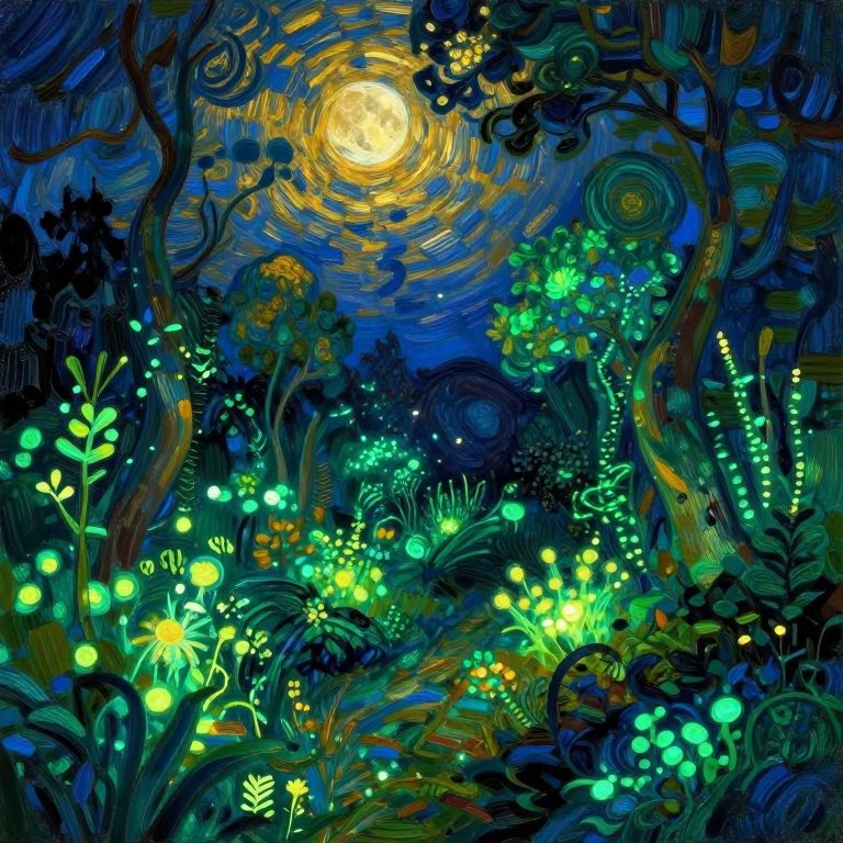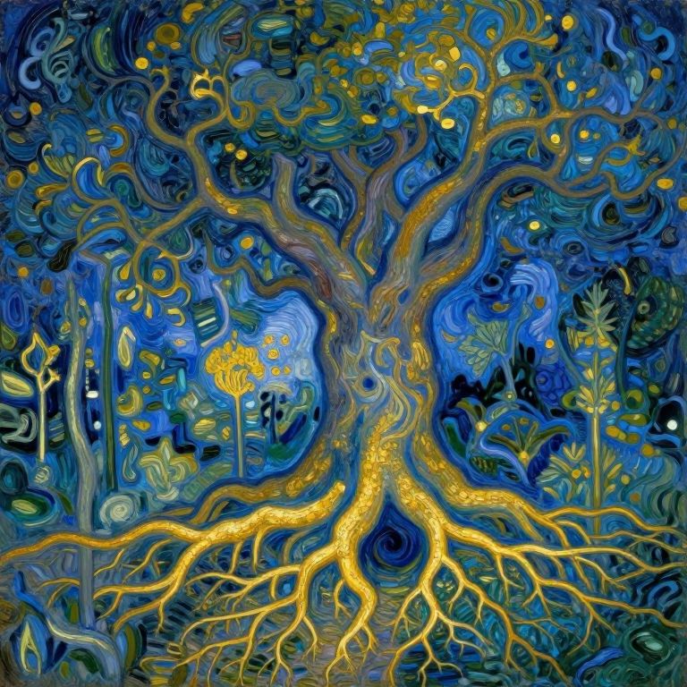 Create an image of a magical garden pulsating with vibrant shades of azure and gold, echoing the lively spirit of Post-Impressionist artistry. The heart of this enigmatic scene is an ancient tree, its branches extending like brushstrokes across a canvas. From within its sturdy trunk, radiant golden roots extend beneath the soil, weaving an intriguing network that leads to a hidden underground realm. This captivating tableau represents the deep connection between nature and the mysterious, suggesting that the garden thrums with an arcane rhythm, discernible only by those who can interpret its cryptic language.