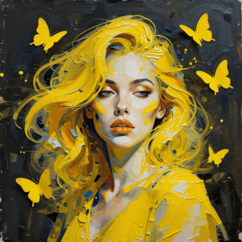 This digital painting in a vibrant, impressionistic style features a beautiful woman with wavy, bright yellow hair that contrasts sharply against a dark, almost black background. Her skin is fair with a slight blush, and she has full, red lips. Yellow butterflies are scattered around her head, adding a whimsical touch. She wears a yellow garment that blends with her hair and the butterflies. The painting uses bold, expressive brushstrokes and a limited color palette of yellows and blacks, creating a striking, ethereal effect. Her gaze is serene and slightly aloof, adding to the mystique of the image.