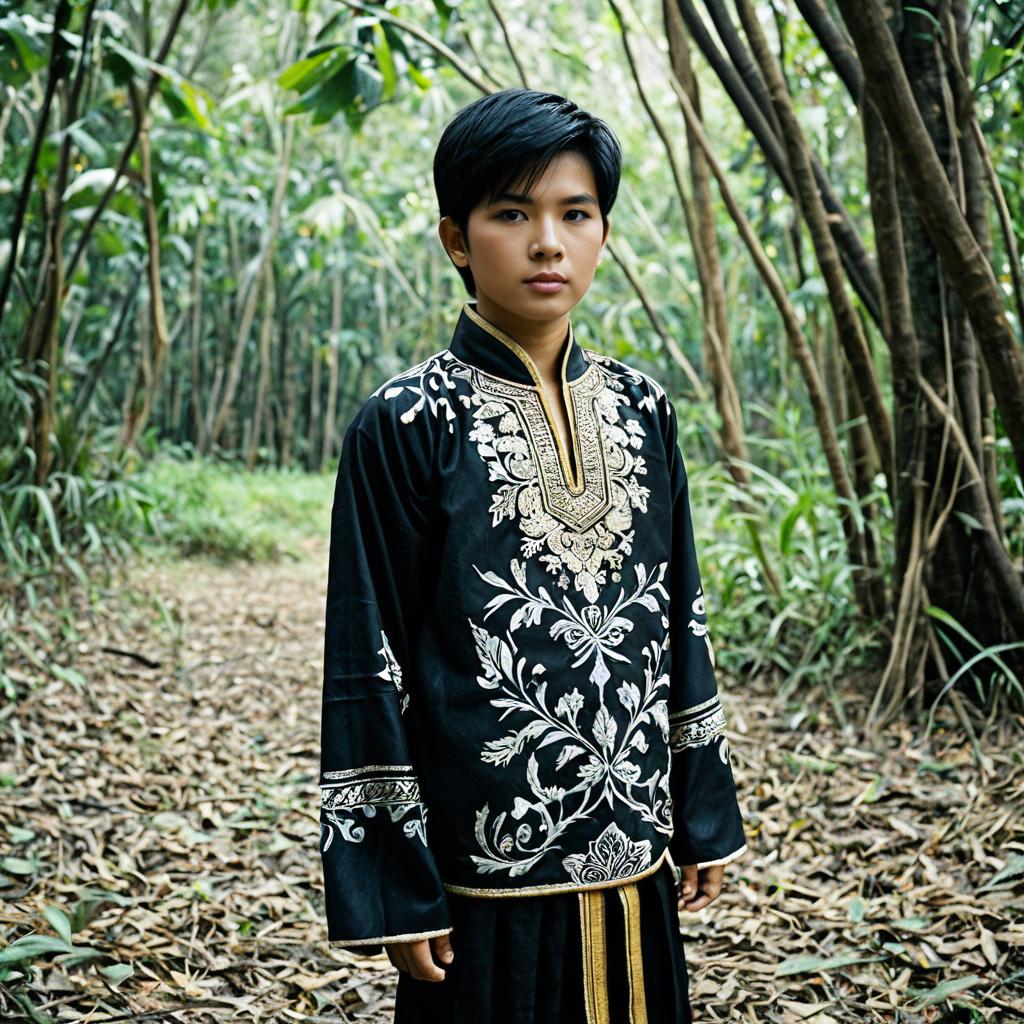 Male thailand costume,1boy, solo, male focus, black hair, outdoors, nature, tree, forest, standing, looking at viewer, long sleeves, realistic