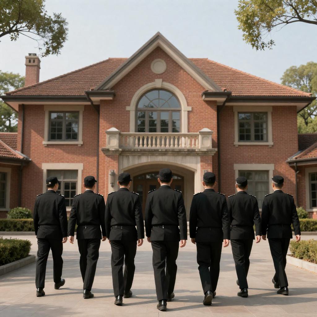 Men in Black Uniforms Approaching Mansion