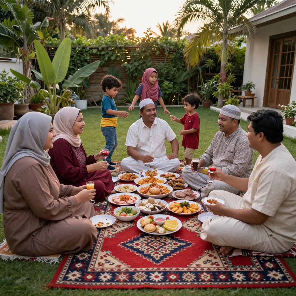 Fat Muslim family enjoying a festive meal outdoors, colorful dishes on traditional rugs, joyous gathering with children playing, lush garden setting, sunset lighting