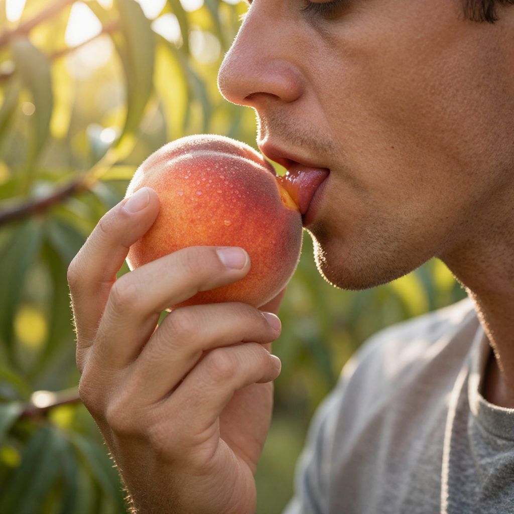 Man eating peach in a sunlit orchard, golden light filtering through leaves, vibrant colors, juicy peach with droplets of juice, serene expression, detailed textured skin, warm summer atmosphere, photorealistic style