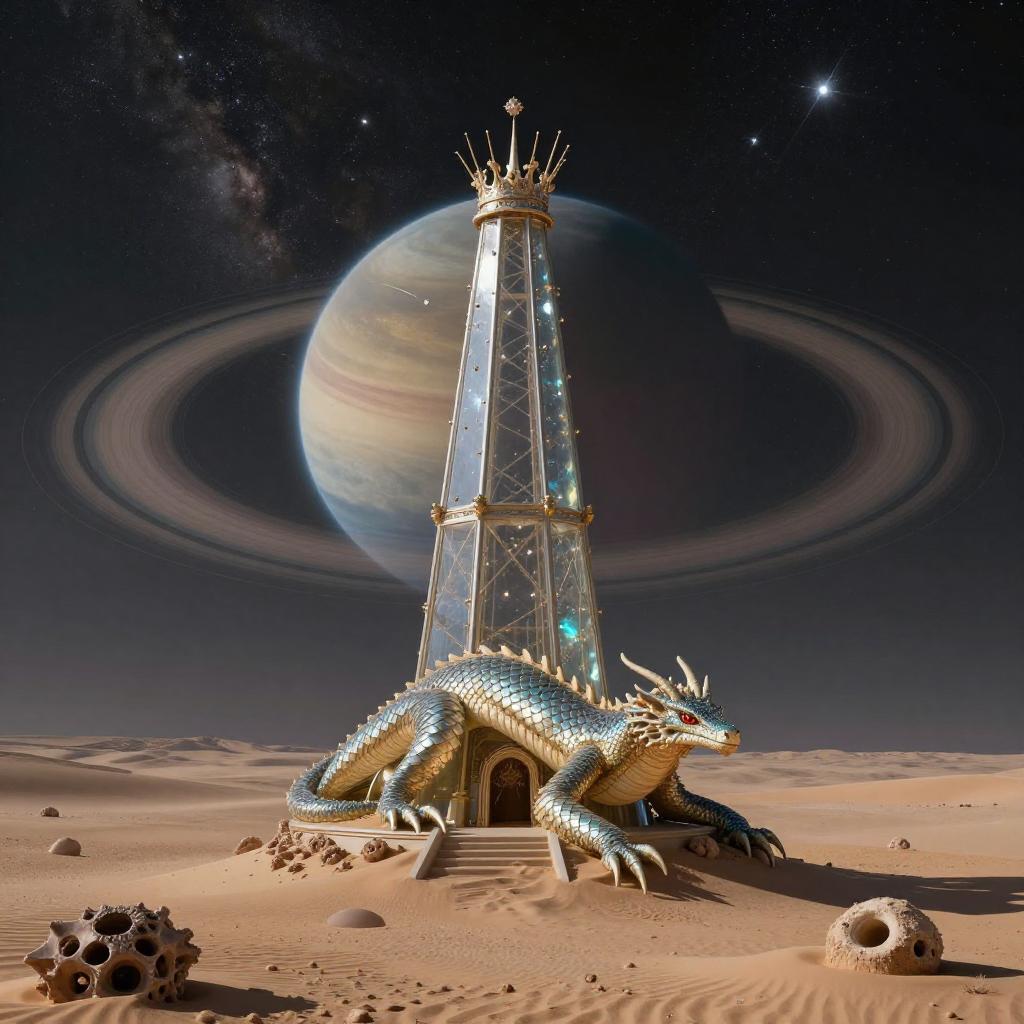 Starlit sand-wyrm oracle opalescent scales, crown of drifting micro-comets perched in glass-sanded observatory spire rising from a fossilized desert plain beneath a ringed planet and meteor showers. Shot on Leica S3 with 80mm Summarit-SL, hyperdetailed, 8K HDR, dramatic lighting, cinematic atmosphere.