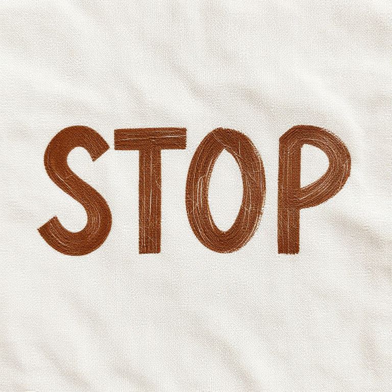 Stop rayon message painted on a fabric texture background, rustic natural tones, eco-friendly style, detailed textile fibers visible
