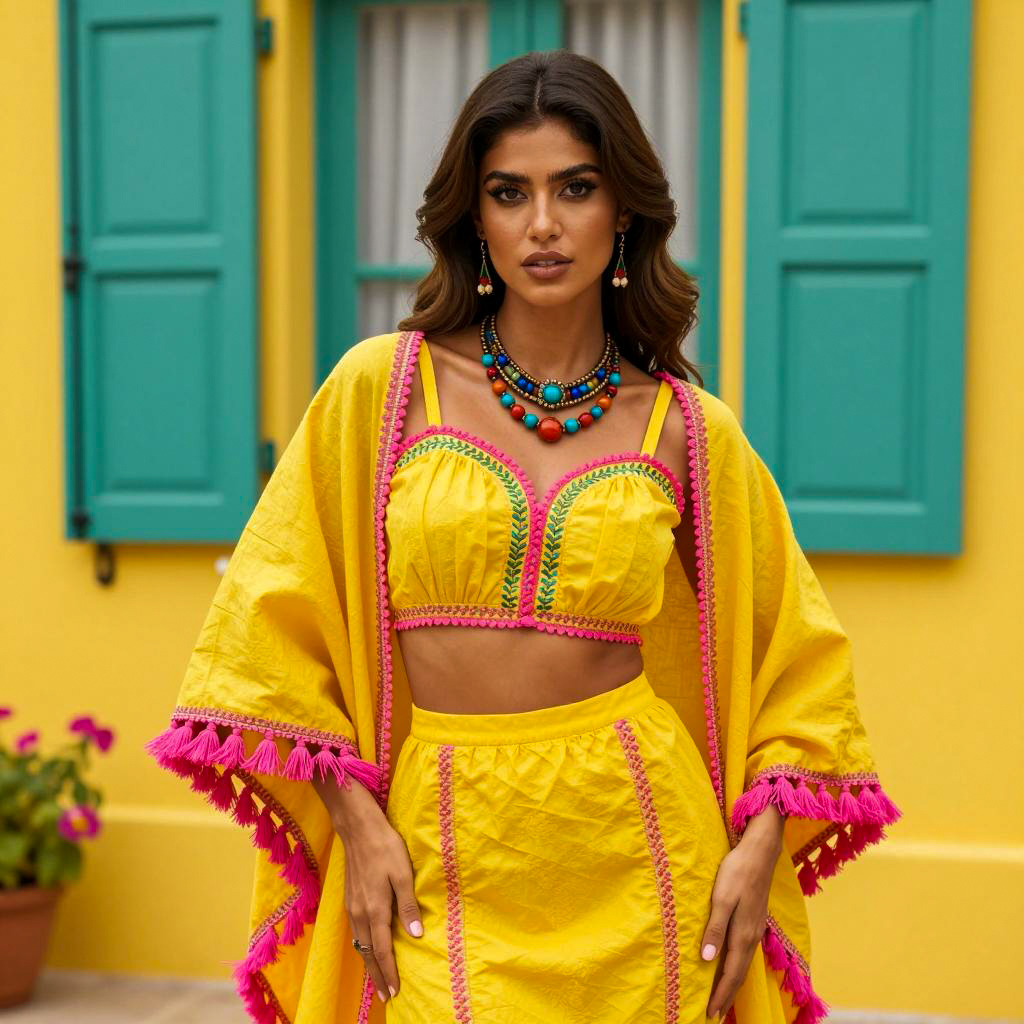 Tamatoa moana costume, photograph of an Asian woman wearing traditional yellow costume with fluffy pom-poms, long fringe skirt, and topknot hairstyle, standing outdoors in bright sunlight, tropical setting, palm leaves and straw hats in background, blurred crowd with diverse people in casual clothes, sunny day, clear blue sky, vibrant colors, cultural attire, front-facing, serious expression