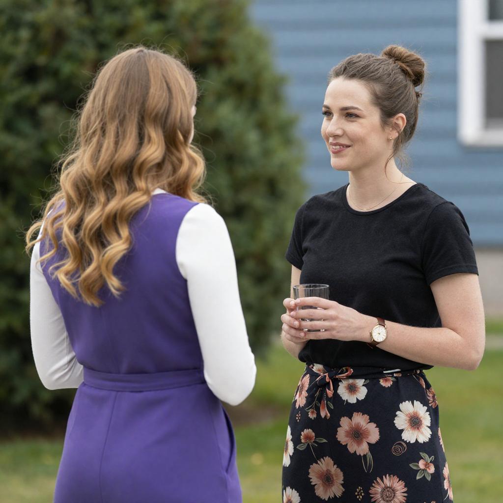 Photograph of two women outdoors. The woman in the foreground, with glasses and brown hair in a ponytail, wears a navy blue short-sleeve shirt and looks at the other woman. The second woman, with long brown hair, wears a light gray shirt and is seen from the back. Dense green foliage forms the background.