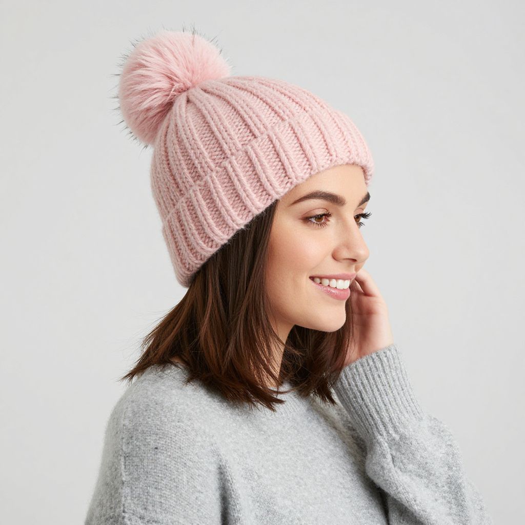 Smiling woman wearing a cozy pink knitted hat with a fluffy pom-pom, paired with a soft gray sweater, exuding warmth and style for fall or winter.