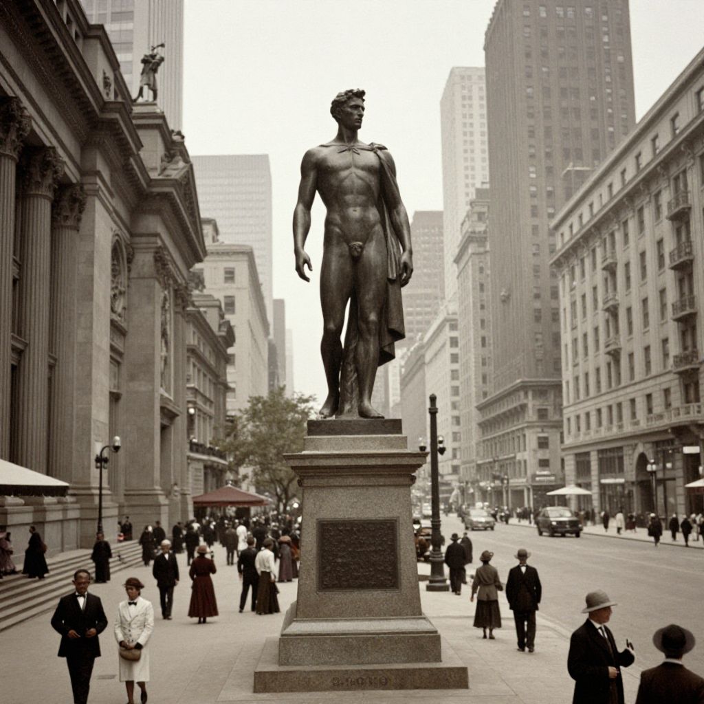 Photograph of a busy urban street featuring a tall, black bronze statue of a muscular, nude male figure standing confidently on a stone pedestal. The statue is centered in the frame, surrounded by tall, historic buildings with classical architecture on both sides. Pedestrians, dressed in formal and business attire, walk along the sidewalks, with some looking up at the statue. The background reveals a cityscape with modern skyscrapers. The image has a black-and-white filter, giving it a vintage, timeless feel. The sky is overcast, contributing to the muted, monochromatic color palette.