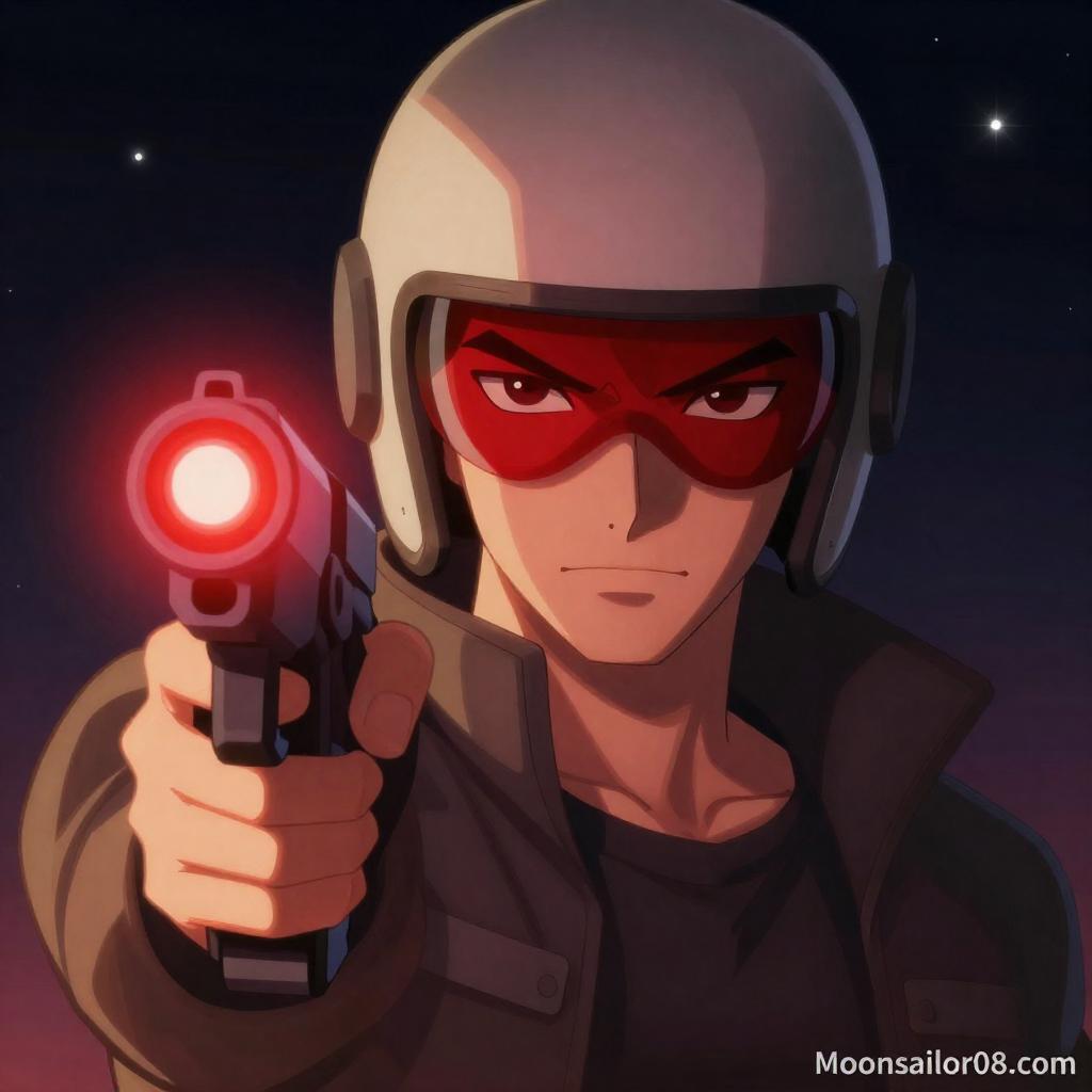 Digital illustration of a male character with a white helmet and red visor, holding a glowing red-tipped finger gun. His face is shadowed with intense red and yellow lighting. Background is a starry night. Character has sharp, focused eyes. Artist's "Moonsailor08.com" is in the bottom right corner.
