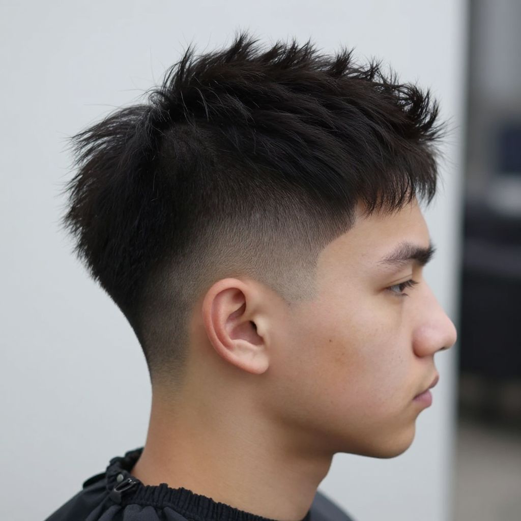 Photograph of young Asian man with short, spiked black hair featuring a high fade and undercut, in profile view against a blurred white background.