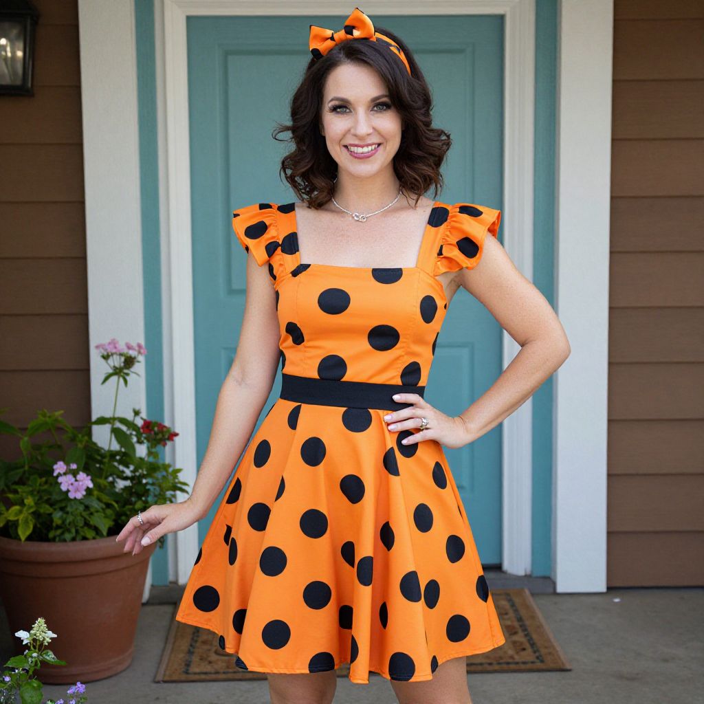 "Wilma Flintstone Adult Costume Woman, woman in orange and black polka dot dress posing for a picture"
