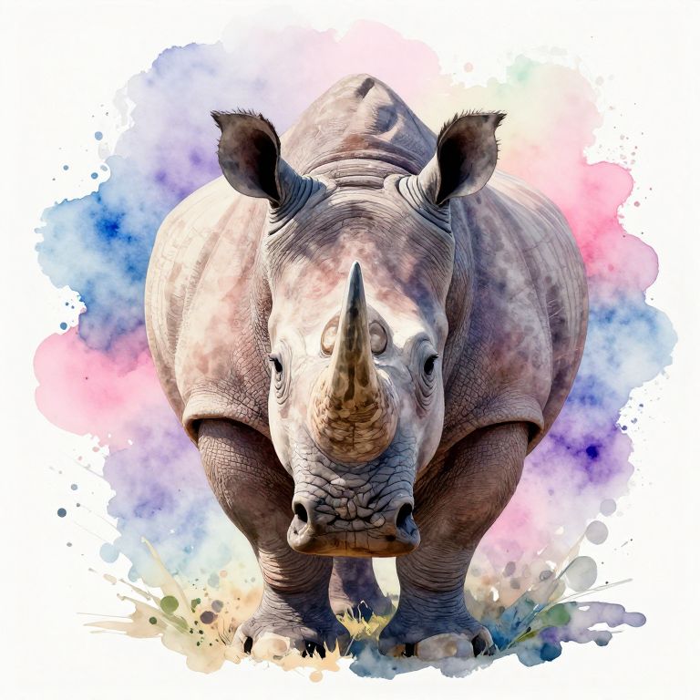 The image features a striking watercolor painting of a rhinoceros, with a vibrant and dynamic splash of pastel colors in the background. The rhino's head and upper body are prominently displayed, with its two horns and large ears clearly visible. The rhino's skin is depicted with intricate textures, showcasing the rough, wrinkled surface typical of the animal. The background is a beautiful blend of soft pastel hues, including shades of pink, blue, and purple, creating a striking contrast with the rhino's more muted tones. The overall composition is balanced, with the rhino positioned centrally, and the splash of colors framing it, giving the image a sense of depth and movement. The interplay of colors and textures enhances the visual appeal, making the rhino the focal point of the artwork.