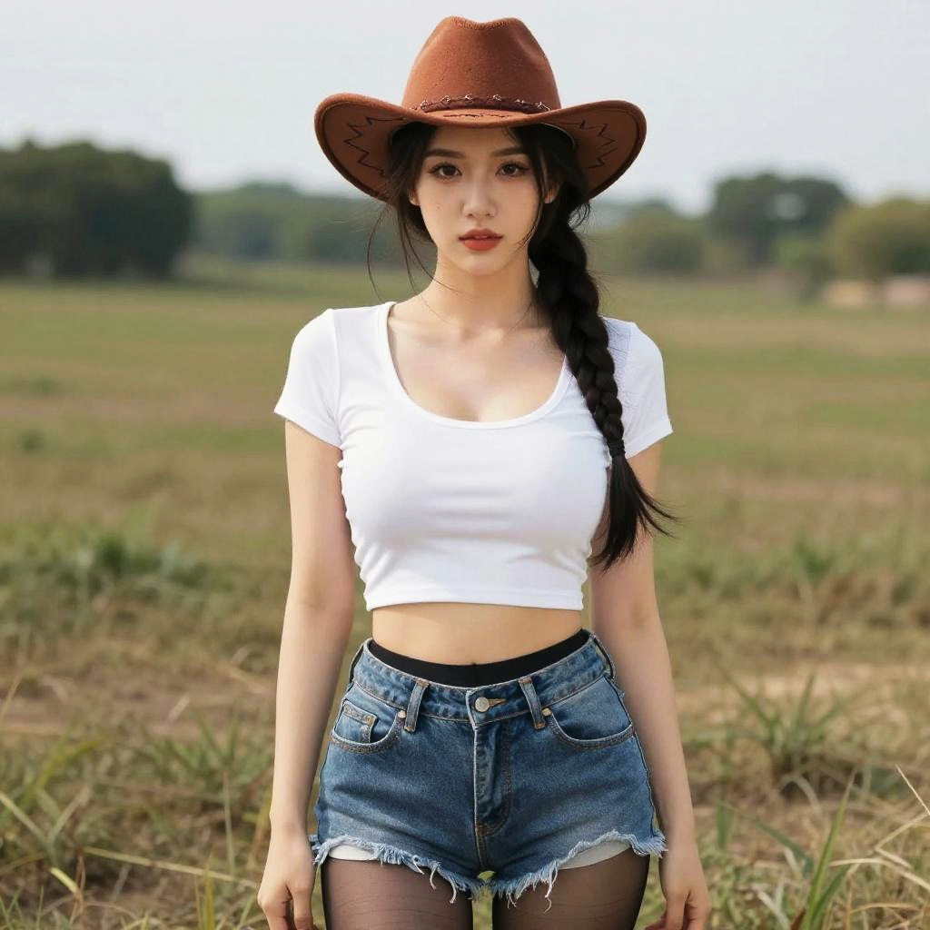 Photograph of an Asian woman standing in a grassy field. She has long black hair in a side braid, wearing a brown cowboy hat, white crop top with a round neckline, and frayed blue denim shorts with black leggings underneath. Her expression is neutral, lips slightly parted with red lipstick. The background shows a blurred, green field with trees in the distance. The lighting is natural, casting soft shadows. The woman's skin tone is light, and she exudes a casual, rustic style.
