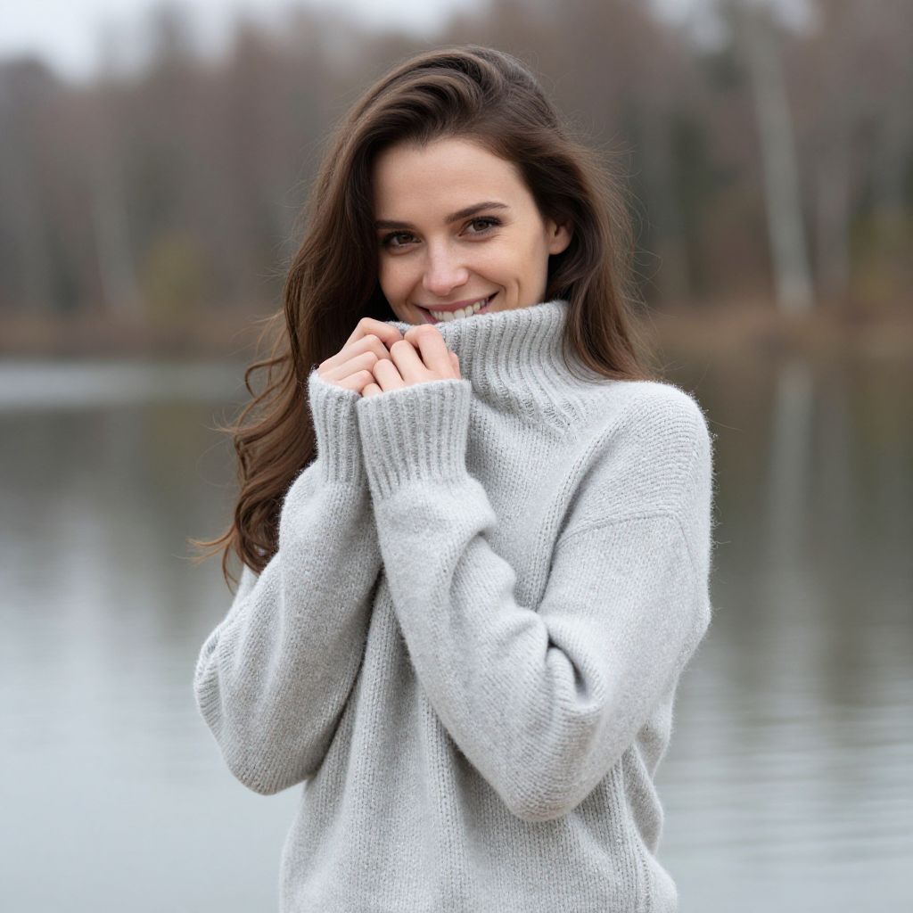 A photograph of a smiling woman with long brown hair, wearing a cozy, light gray knitted sweater. She's standing by a calm lake with blurred trees in the background, holding her sweater close to her chest. The lighting is soft, creating a peaceful, wintery feel. Her expression is warm and friendly, and the overall mood is relaxed and content.