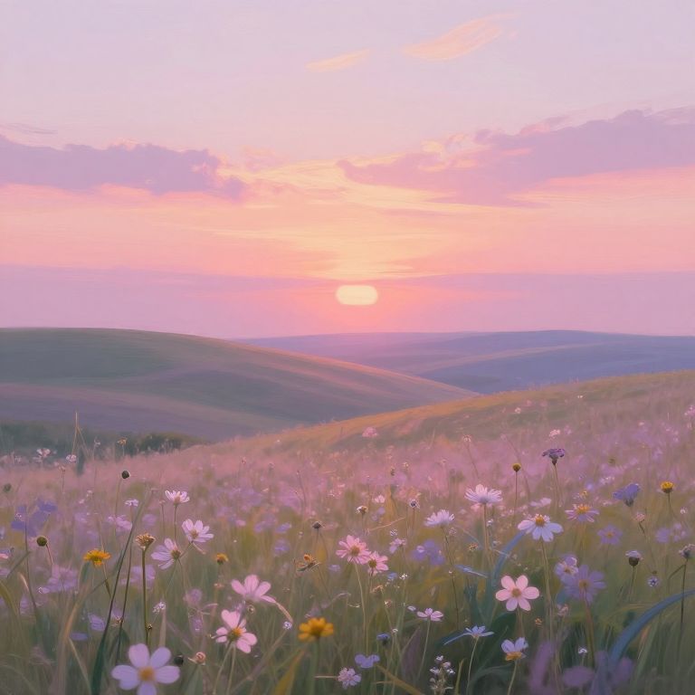 Dalily fields under a vibrant sunset sky, soft pastel colors blending with gentle rolling hills, delicate wildflowers scattered, dreamy atmosphere, impressionist painting style, high resolution, soft focus