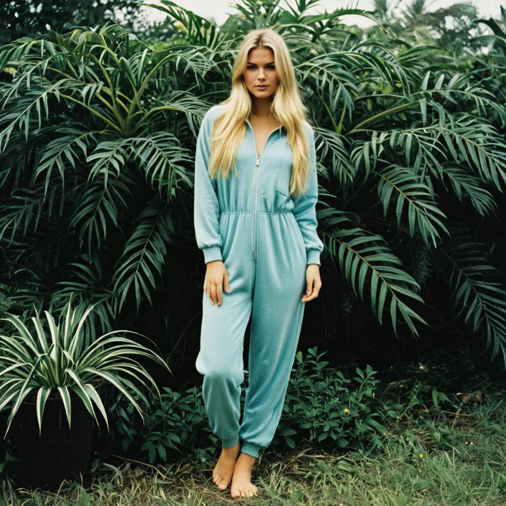 Ladies romper suit,1girl, solo, blonde hair, long hair, barefoot, plant, full body, looking at viewer, standing