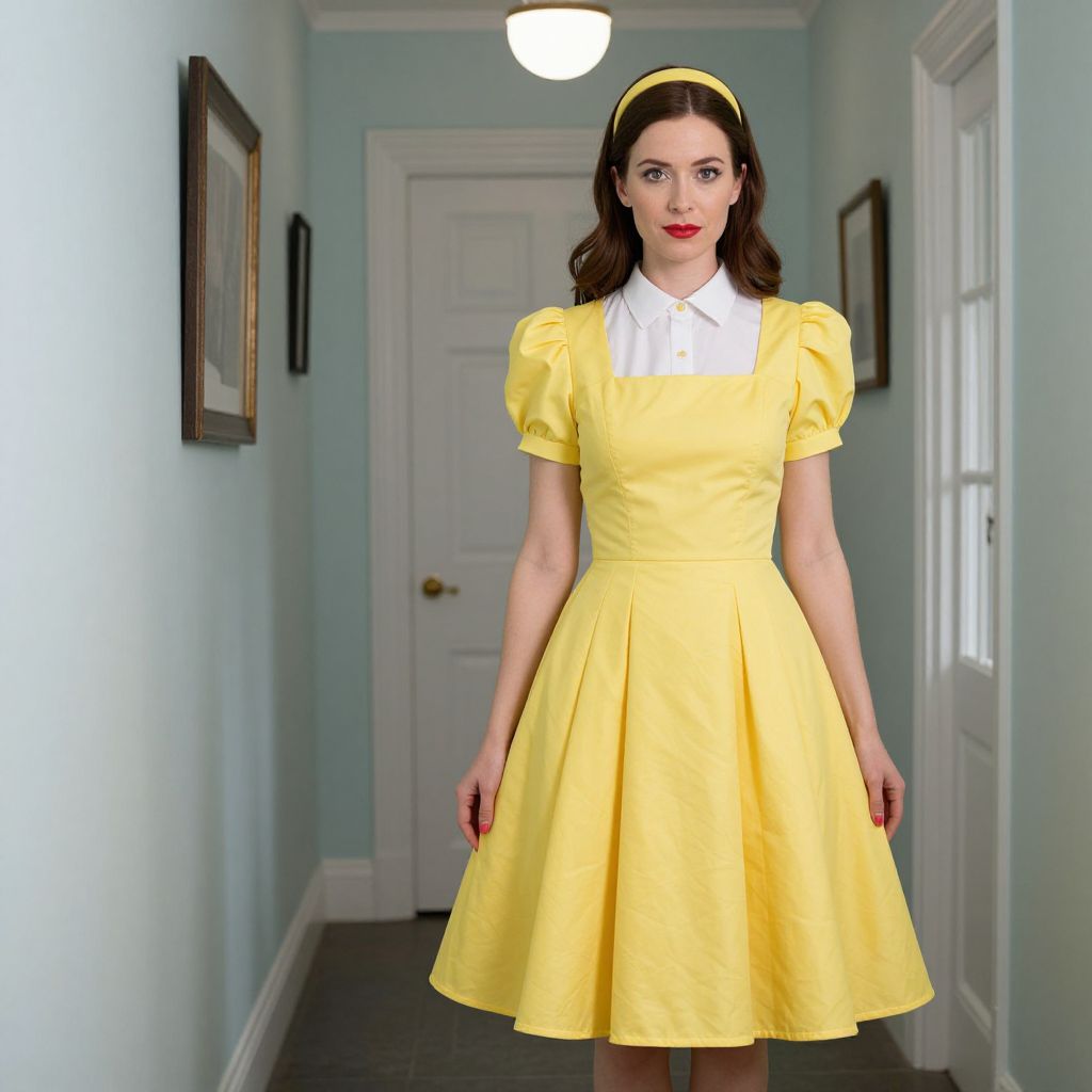 Photograph of a Caucasian woman with fair skin and dark brown, wavy hair, wearing a bright yellow, short-sleeved, A-line dress with a white collar, and a yellow headband. She stands in a narrow, pastel blue hallway with white trim. The hallway has framed pictures on the left wall, a white door with a golden doorknob in the background, and a ceiling light fixture above her head. Her red lipstick contrasts with her yellow dress, and she gazes directly at the camera with a neutral expression. The image has a slightly surreal, digitally enhanced feel.