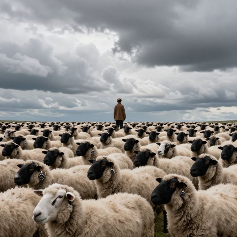 Under a vast sky of ever-shifting clouds, a shepherd stands resolute amidst a sea of sheep, each bearing the weight of unseen timers, symbolizing the delicate balance between guidance and the relentless march of time.
