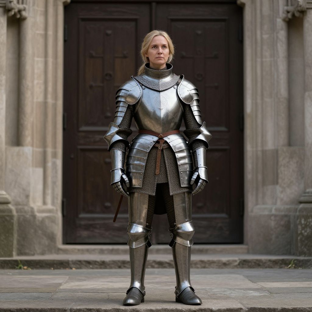 Photograph of a blonde woman in full shiny silver medieval armor, standing in front of a large dark wooden door in a stone building.
