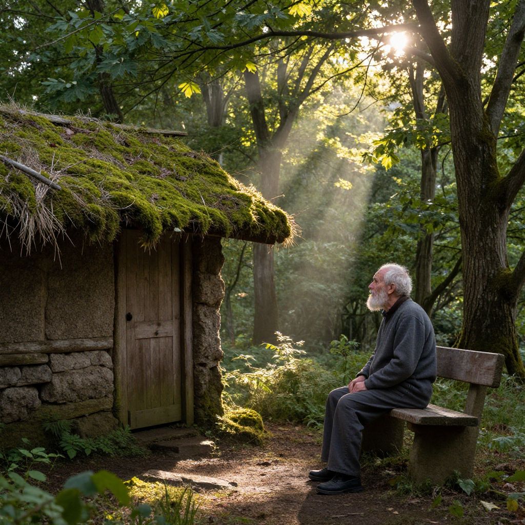 Photograph of an elderly white man with a white beard and short white hair, sitting on a wooden bench in a sunlit forest. He wears a brown jacket and dark pants. To his left, there is a rustic wooden hut with a moss-covered roof. Sunlight filters through the trees, creating a dappled light effect on the ground and his face. The background is dense with green foliage and trees. The man looks contemplatively to his right, away from the camera, with his hands resting on his lap. The scene exudes a peaceful, serene atmosphere.