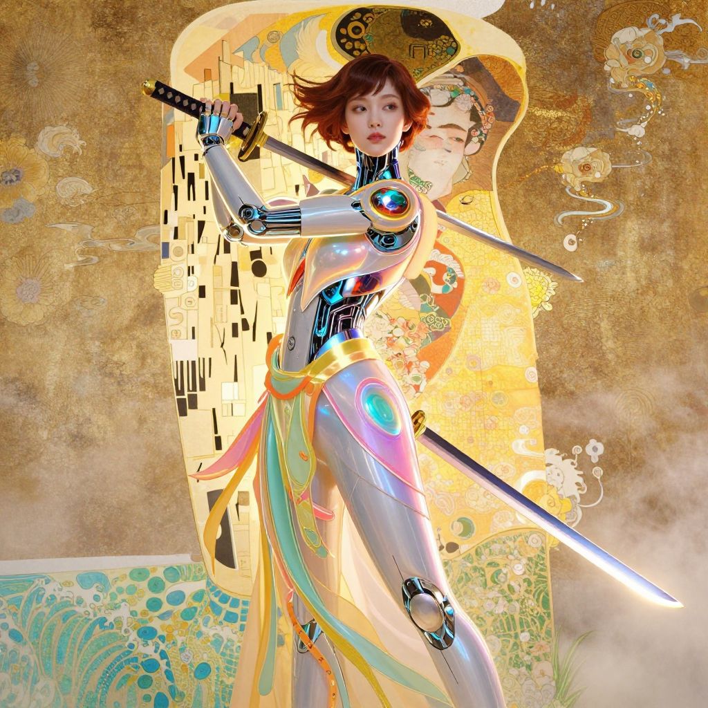 In a dreamscape of vibrant light and energy, an ethereal fusion of grace and strength, a beautiful cybernetic girl poses with a long, sleek katana, her expression poised and serene, Inspired by the flowing elegance of Alphonse Mucha’s organic lines, Klimt's intricate, golden patterns, and the timeless refinement of traditional ukiyo-e, each detail captures the interplay of beauty and power, The girl's attire and cybernetic details exude a playful yet sophisticated cyberpunk aesthetic, with bright neon accents and metallic hues harmonizing with classical art styles, Her sleek limbs and delicate, intricate circuits glow softly, each line and curve meticulously detailed, The background bursts with stylized ukiyo-e waves and floral motifs, and the scene is illuminated with a warm, nostalgic glow, as if bathed in golden hour sunlight, Soft cinematic haze surrounds her, enhancing the interplay of shadows and light, while delicate gradients and vibrant colors blend effortlessly into a stunning, ultra-high-definition visual statement, Her figure, composed with bold outlines, smooth curves, and an exquisite balance of warm pastels and radiant metallics, stands out with dynamic precision, This is a masterpiece that melds classical art with futuristic energy, a timeless portrait captured with the spirit of elegance and strength in perfect harmony