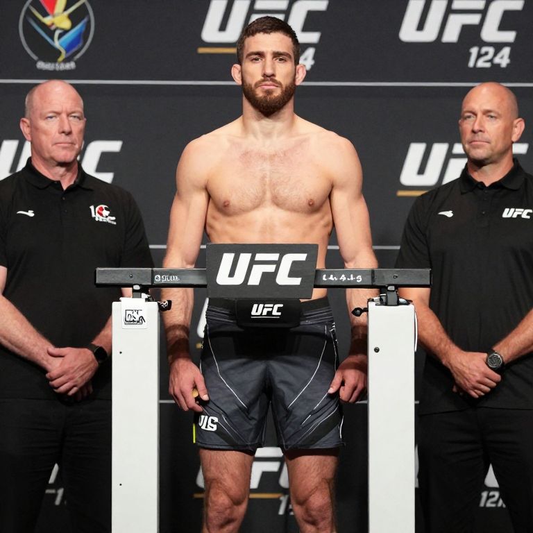 Photograph of a muscular, shirtless male UFC fighter with dark hair and beard, wearing black shorts, standing between two officials, UFC logo and weight