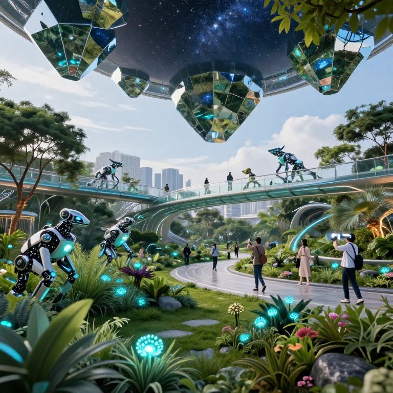 Futuristic settings showcasing an advanced urban park blending nature and technology, with bioluminescent plants, robotic wildlife, glass walkways, floating mirrors reflecting the starry sky, and people enjoying augmented reality experiences in a serene yet technologically enhanced environment.