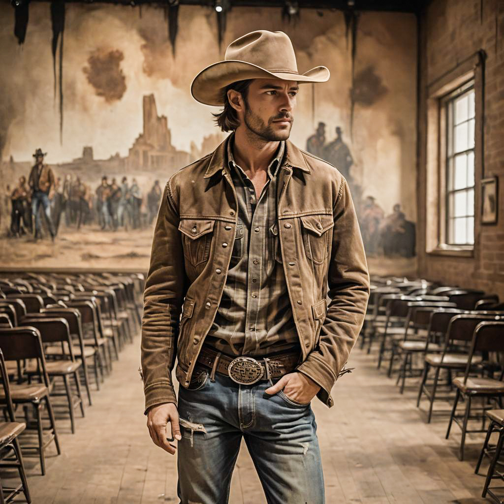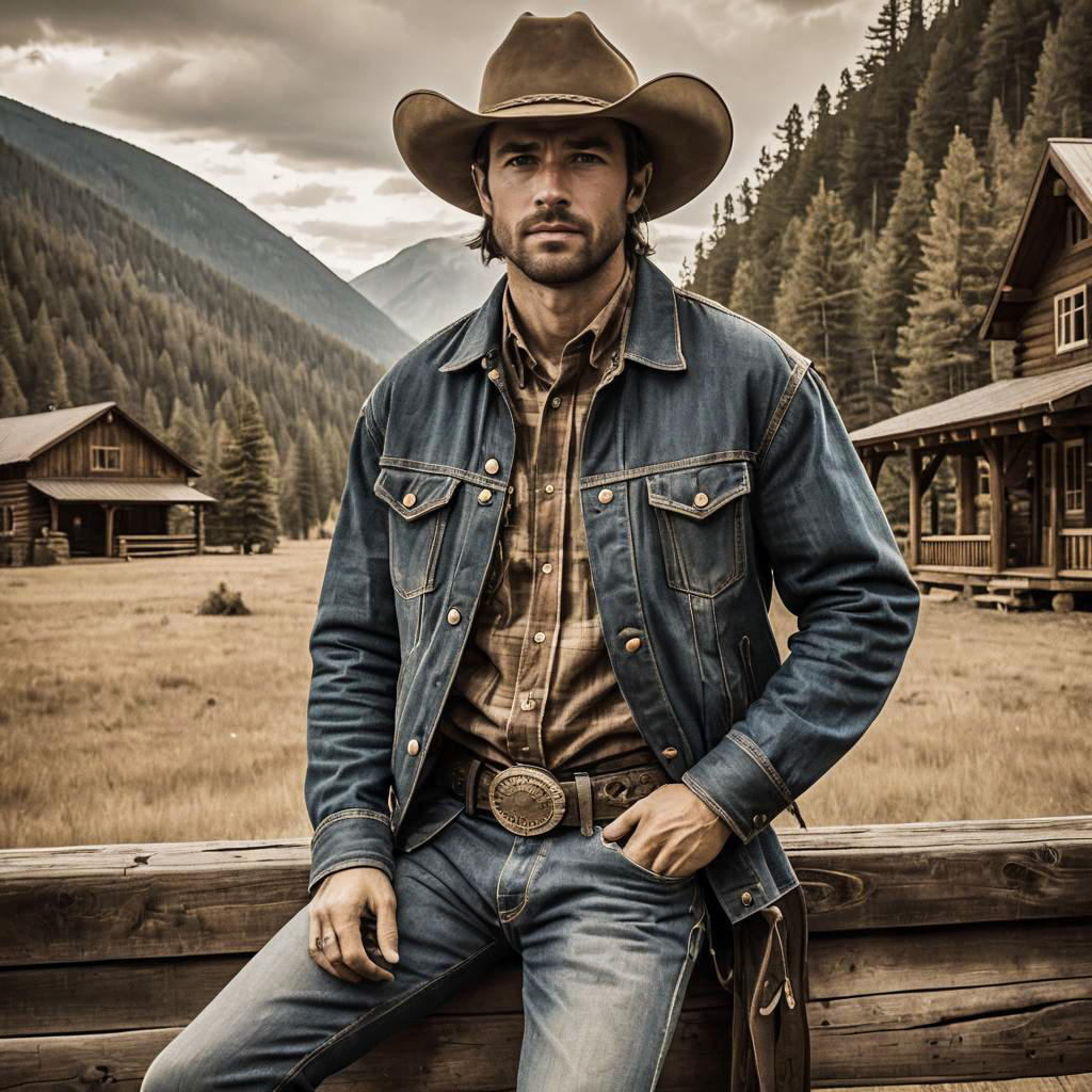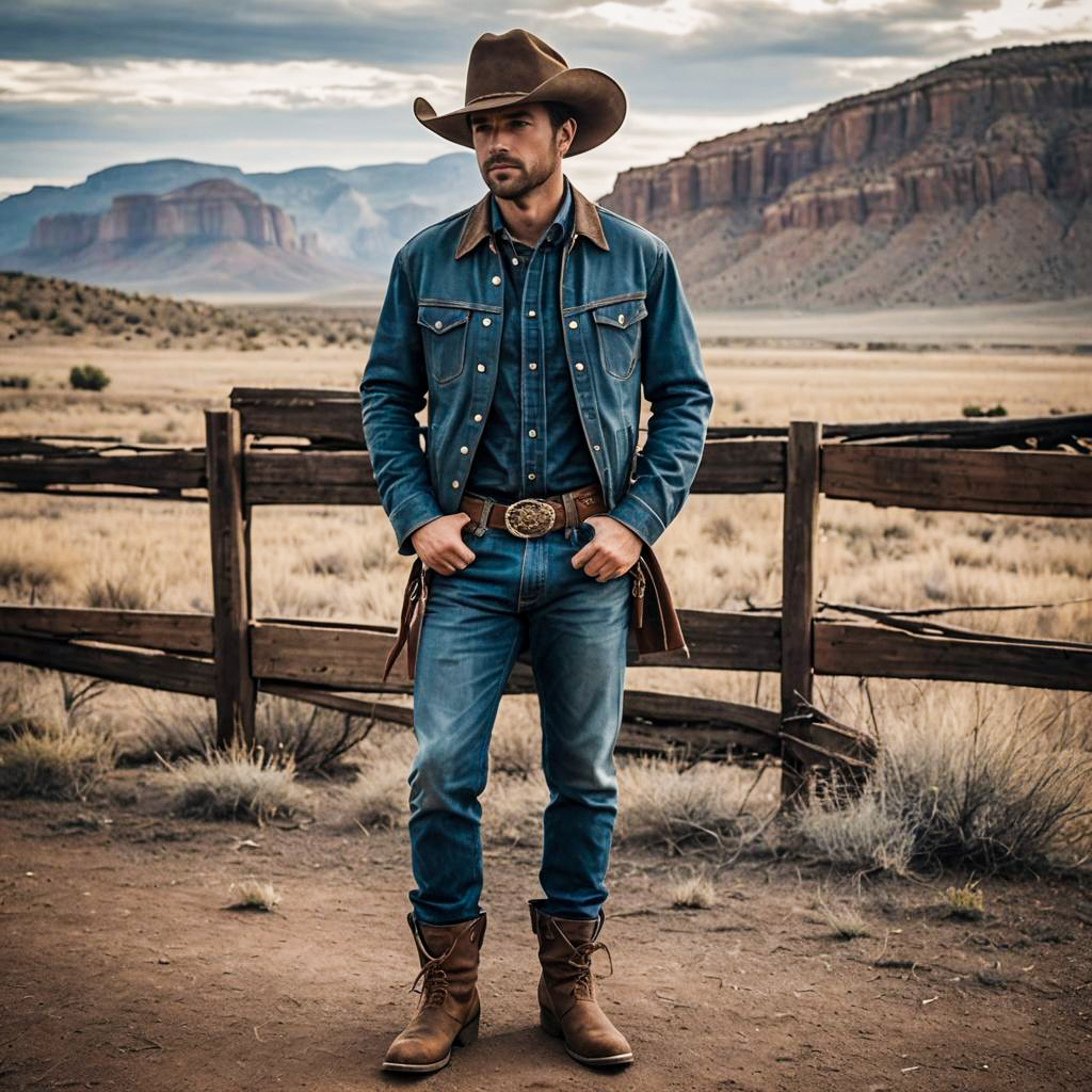 Photo of a Athletic man, Medium Length, ken cowboy outfit, cowboy hat, leather jacket, plaid shirt, leather boots, cargo jeans, western belt, rustic, rugged, classic cowboy style, Dusty Blue earthy tones, casual, masculine, Ranch, cinematic vivid