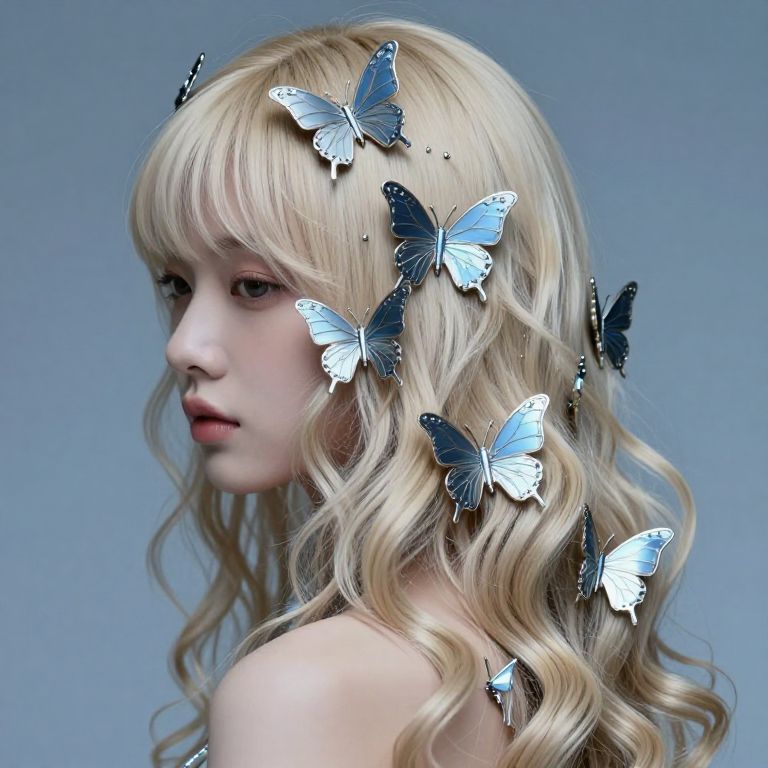 Pics cheveux made of metal and enamel, shaped like delicate butterflies, embedded in refined blonde hair styled in soft waves, futuristic aesthetic with a subtle sci-fi twist, cool blue and silver color palette, studio lighting emphasizing detail.