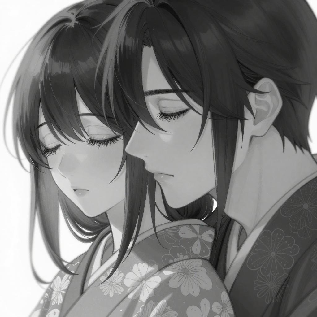Black and white, digital art, manga style, close-up, young man, young woman, long hair, closed eyes, floral kimono, soft lighting, intimate, gentle expression, side profile, hair over eyes, delicate features, subtle shadows, detailed textures, monochrome, grayscale, emotional, peaceful, tender moment, traditional Japanese clothing, fine lines, high contrast, serene atmosphere, quiet intimacy
