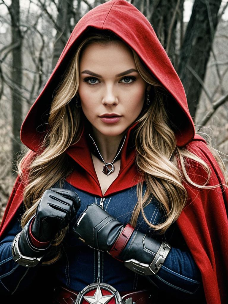 Civil war scarlet witch, 1girl, solo, hood, earrings, jewelry, belt, long hair, brown hair, realistic, drill hair, looking at viewer, blonde hair, gloves