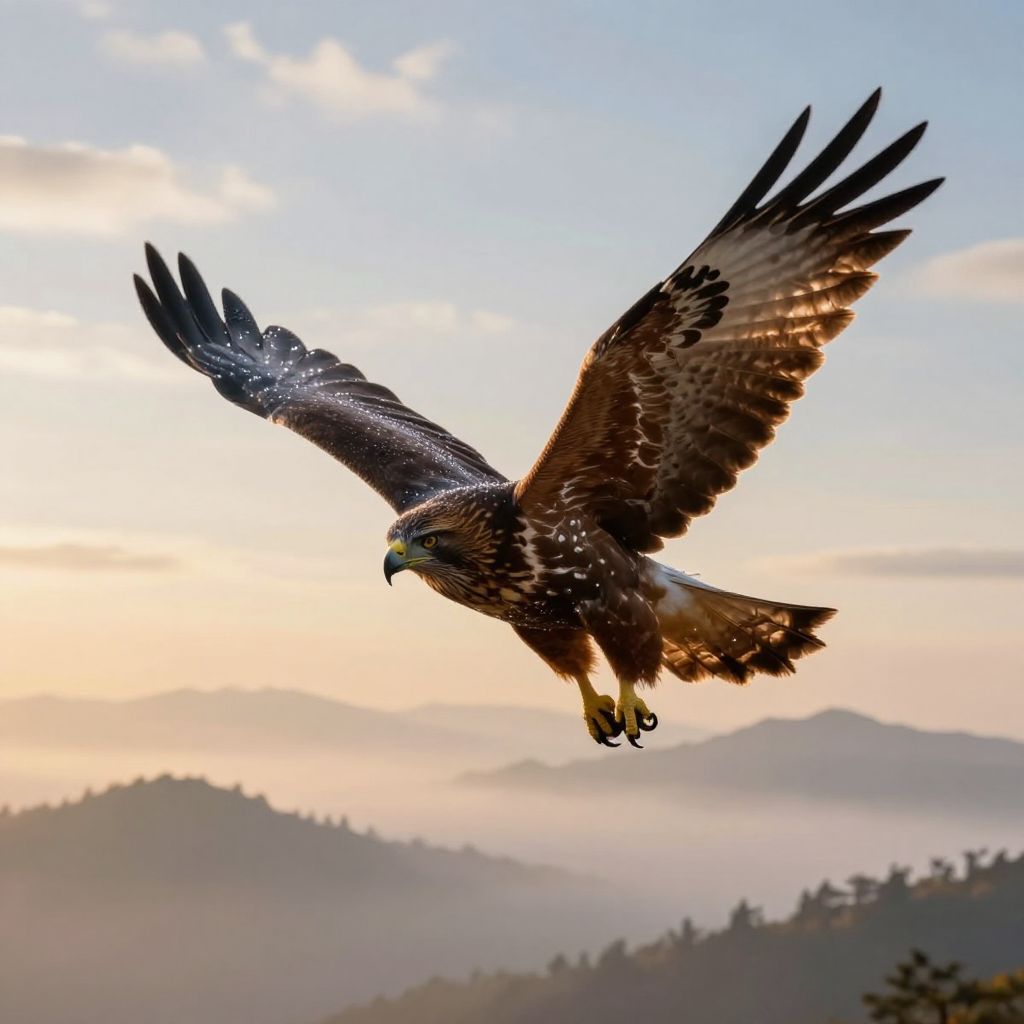 Hawk a lugi soaring high above misty mountains at sunrise, detailed feathers glistening with dew, realistic style with vibrant warm tones, dynamic sky background with soft clouds and faint golden light, majestic and powerful atmosphere