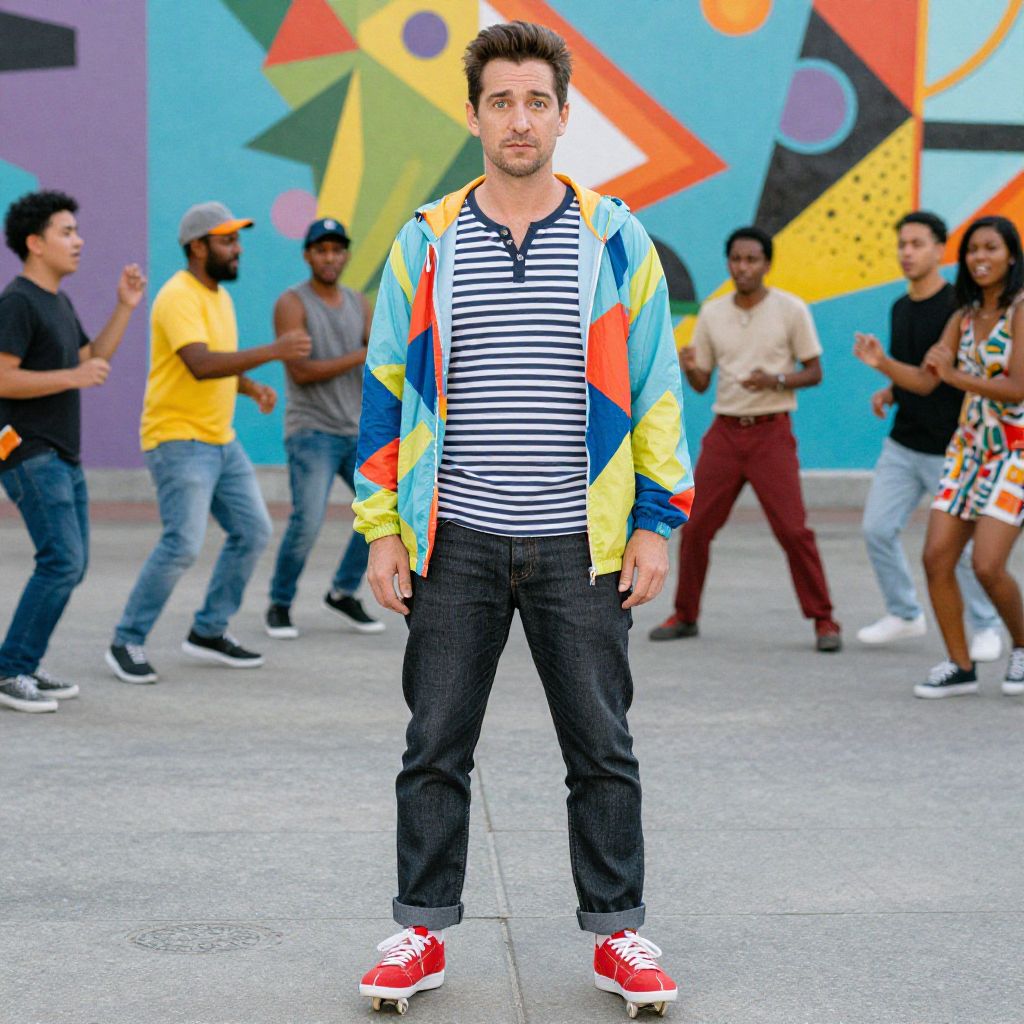 A man, striped Henley shirt, dark grey cuffed jeans, vibrant red skate shoes, bright lightweight windbreaker, bold geometric shapes, vibrant murals, lively street performers, technicolor film style, playful expression Man has masculine face and piercing eyes