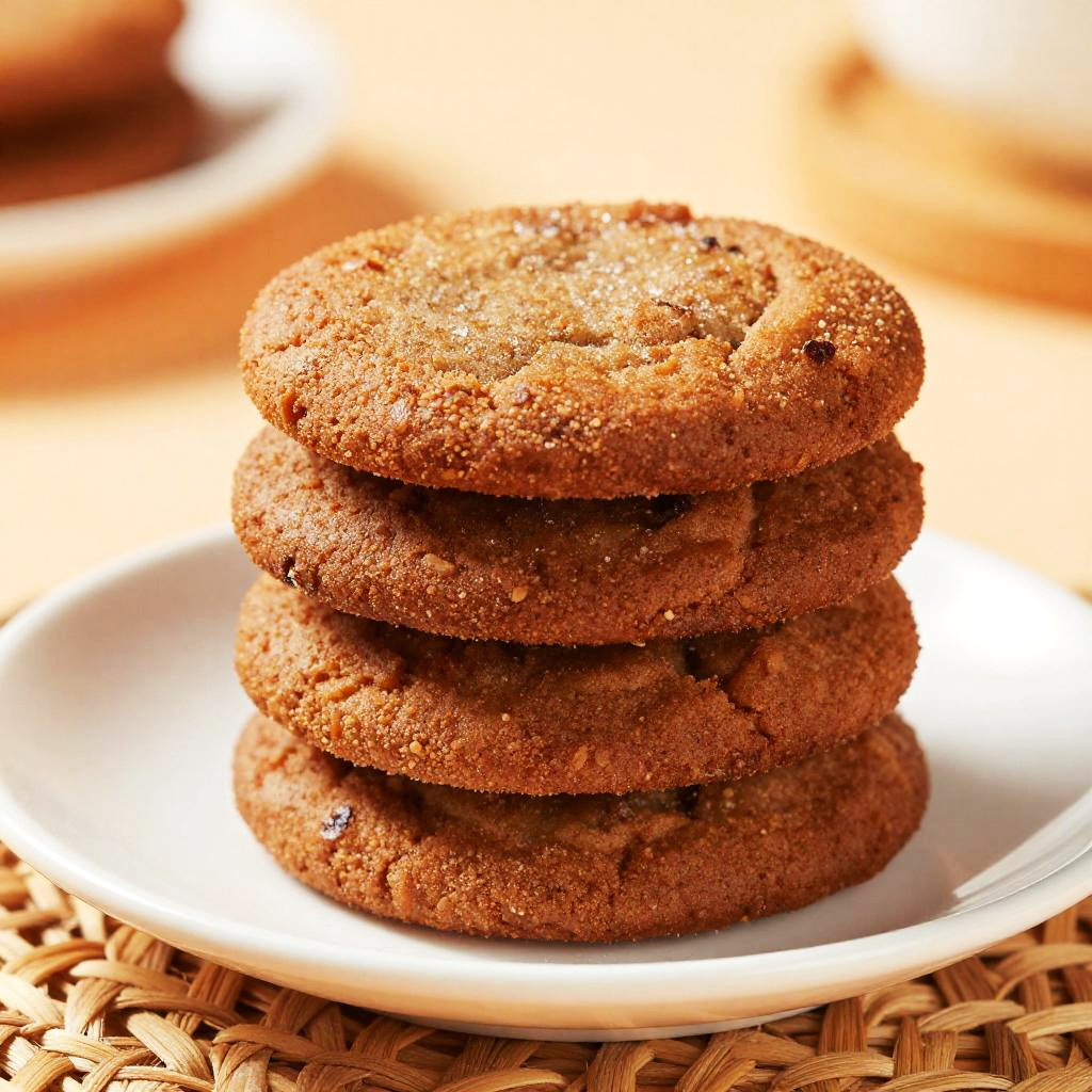 This is a close-up photograph of a stack of six round, brown cookies with a slightly rough texture, dusted with sugar. They're piled on a white square plate, placed on a woven mat. The background is blurred with warm, orange tones, creating a cozy, inviting atmosphere. The lighting highlights the cookies' sugary tops and texture.