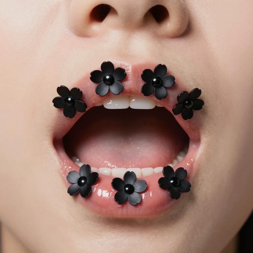 Close-up photograph of a person's parted lips with a glossy sheen. Black flower-shaped decorations are evenly spaced on the lips. Thin white liquid is visible on the lips and between the flowers. Skin tone is light. Lips are slightly curved.