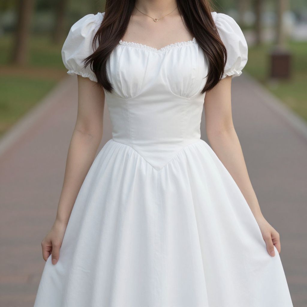 Photograph of a woman wearing a white, short-sleeved, puffed-sleeve, vintage-style dress with a fitted bodice and full skirt. The dress has a scalloped neckline and a subtle, pleated texture. She has long, dark brown hair partially visible, and wears a simple gold necklace with a small pendant. Her skin tone is light. The background shows a blurred, tree-lined path with a red-brick surface and green grass on either side. The image focuses on the dress, with the woman's face and lower body not visible.
