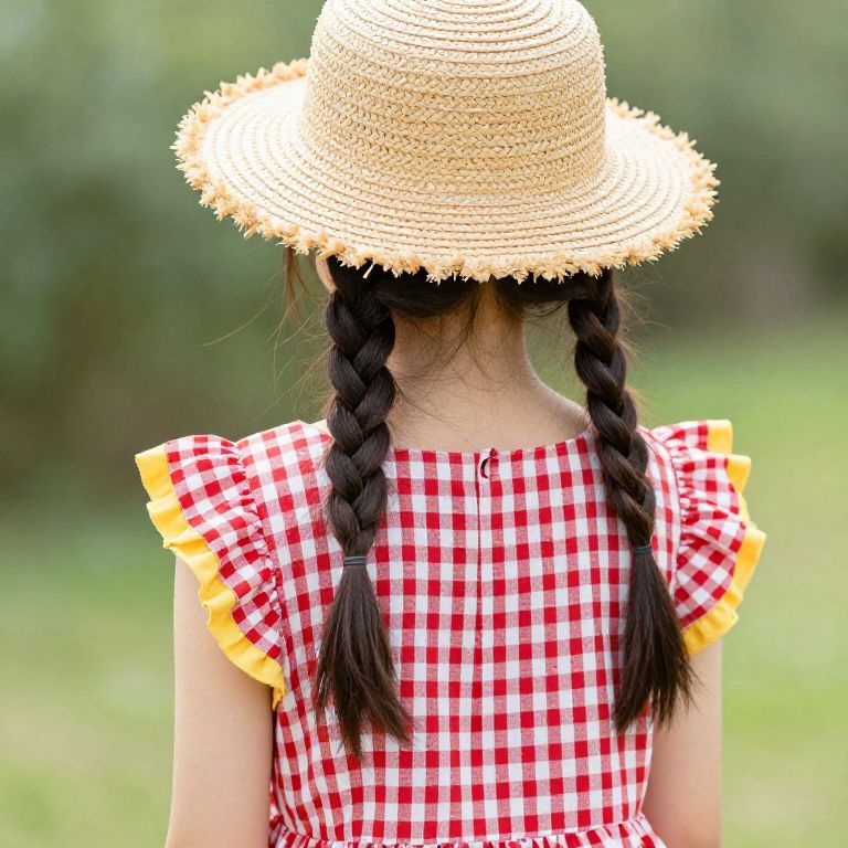 Girl with braids in her hair wearing a straw hat and a red and white checkered dress with yellow ruffles.