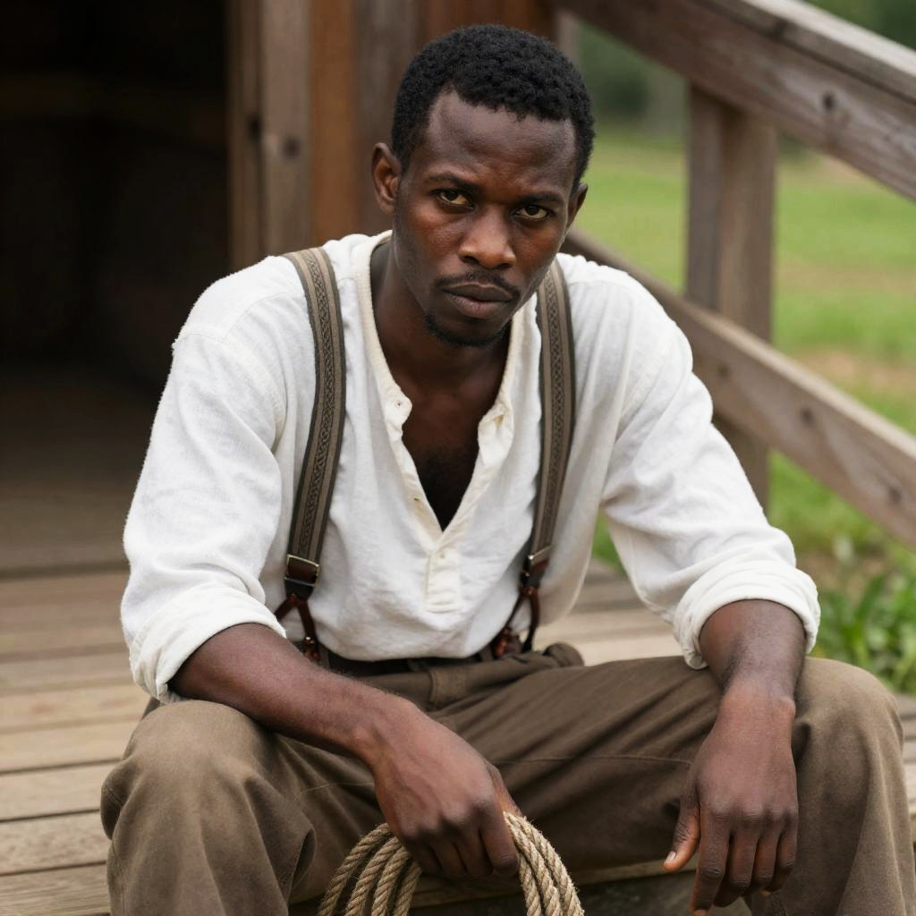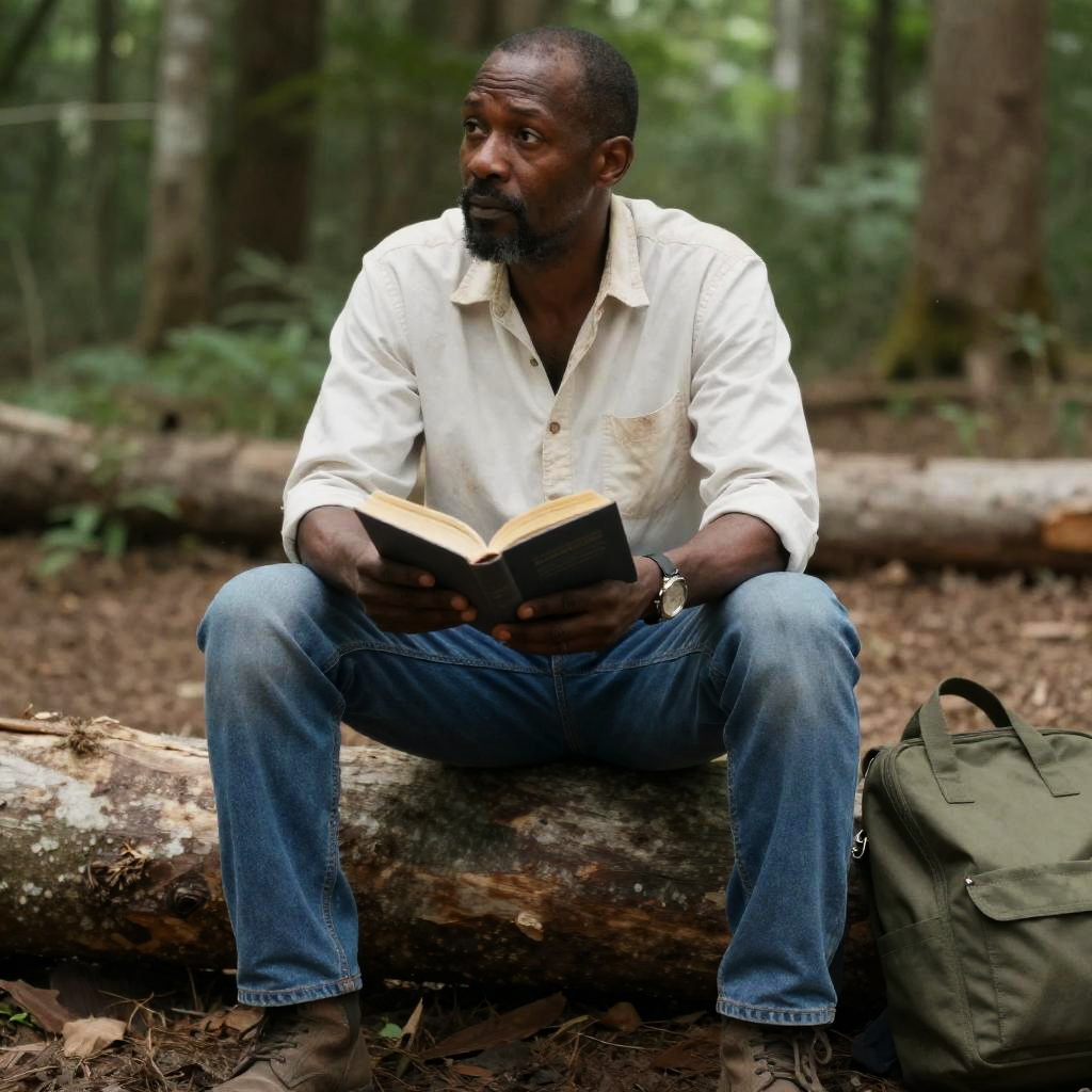Photograph of an African-American man in his 40s, wearing a white hat, glasses, light blue shirt, patterned tie, brown suspenders, and gloves, crouching in a forest. He holds a wooden pole with his right hand, surrounded by green foliage and red flowers. The background is dark and blurred, highlighting the man in the foreground.